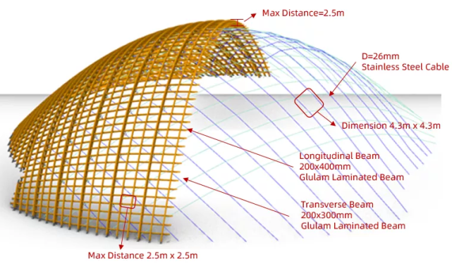 3、太原植物园展览温室采用三层双向交叉叠放胶合木网壳+不锈钢拉索的新型结构体系;