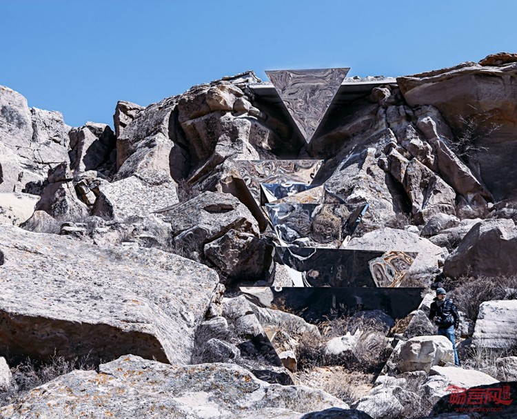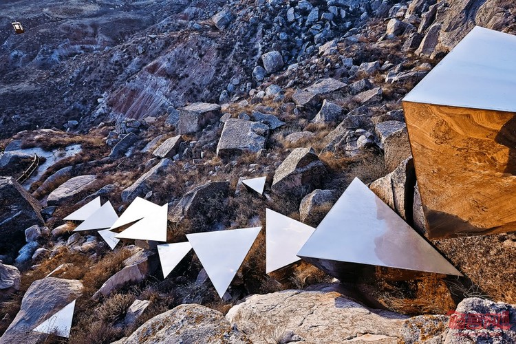镜面不锈钢制成的倒三棱锥,错落置于山坡上。夏季,水在这些三角不锈钢镜面流动形成小瀑布,在大部分季节里,由于椎体表面钢板较薄产生形变,镜像周围环境时发生扭曲,从而呈现出一种微妙的介于隐形与显形之间的状态。