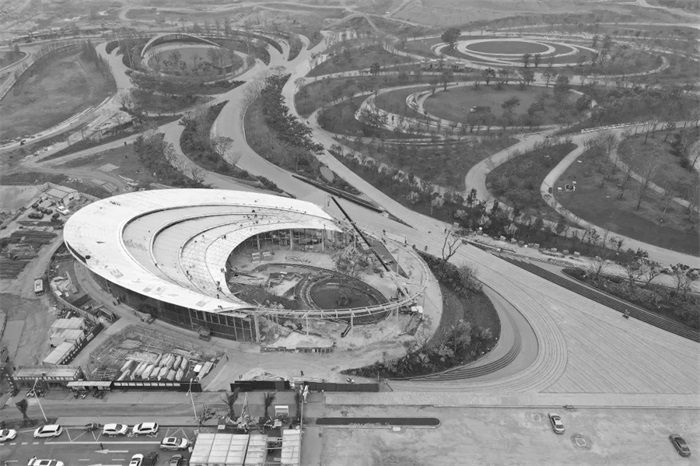 在整体布局上,建筑呈椭圆形,与场地的流线型景观完美地融合在一起,偏向一侧的内庭院与建筑形成了鲜明的虚实对比关系,作为游客进入室内的一个过渡空间,内外共享。连续的曲面屋顶采用银色金属铝板,将室内外统一起来,提供给人们一个休憩娱乐的聚散场所。