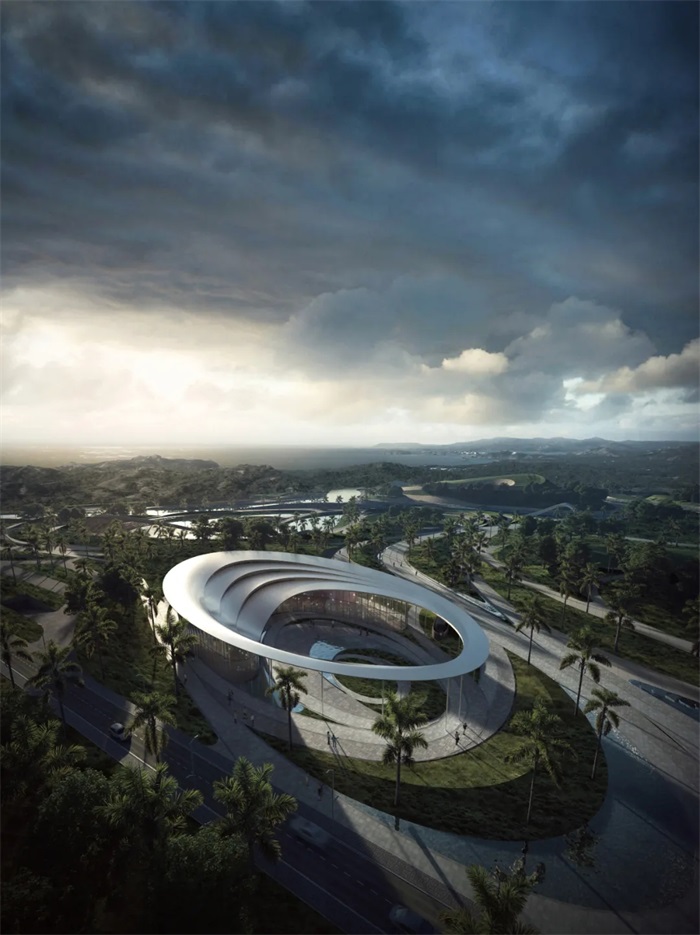 游客中心位于西海岸南片区公园入口处,设计应以自然生态为主且应具有地标性,使其成为城市名片之一。建筑需符合公园整体规划的调性,巧妙应对地块的弧形边界,以流线型的姿态融入景观,与周围和谐统一。同时,也需考虑在地性,适应热带气候,融入海南水滨文化。