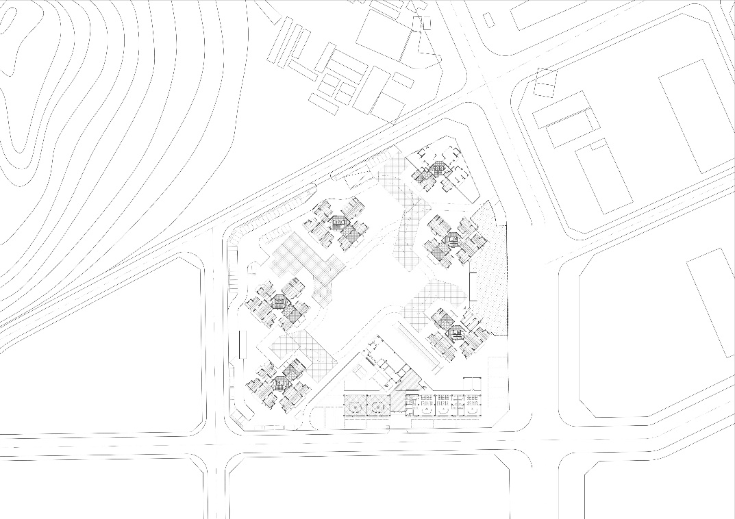 作为一处高容积率、高密度、高净值的小地块住宅,项目试图从城市脉络、场地资源、街道立面、人居体验四大圈层中寻找平衡,打造花园式、会“呼吸”的城市宜居空间。整体布局上庭院朝南向敞开并做架空处理,纵向拓宽庭院空间的同时,最大限度将城市景观纳入进来,减少城市对人居生活空间压迫的同时,让城市空间与区域空间相互渗透,延续城市和周围环境的脉络。