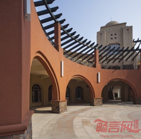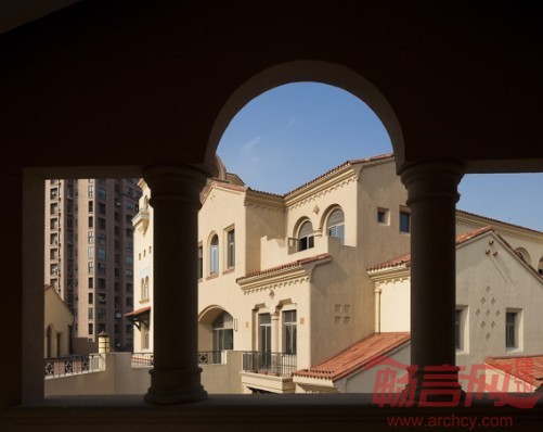 本项目地处城市近郊。针对周边配套的缺失,在项目的首期,设计师就规划设计了一处相当规模的集中商业,并以纯正的西班牙风格将人们一下从城市的喧闹拥挤中引入到休闲度假的南欧风情里来,并且整个商业的风貌也自然成为的整个住宅风貌的导引。