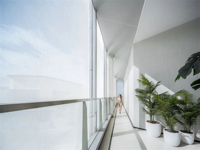 这次选择PTFE而非ETFE的原因是,PTFE网格膜能提供达到消防规范通风要求的孔隙率,这使得建筑师在真实建筑边界和膜材之间可以制造了一个暧昧的气候腔体。这一腔体既不属于室外也不属于室内,而是一个充满柔和的光线、茂密的绿植以及微风的灰空间,是地处北回归线以南的岭南地区一种在地性气候的当代表达。