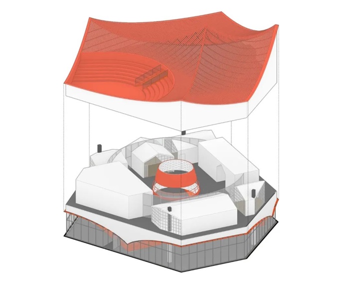 我们用橘红色铝型材格栅按照设计的山地起伏做成屋顶,覆盖了屋面上的户外空调机组和排烟机房。一个建筑师做到这里也算完整圆满。但是这对我而言还远远不够。