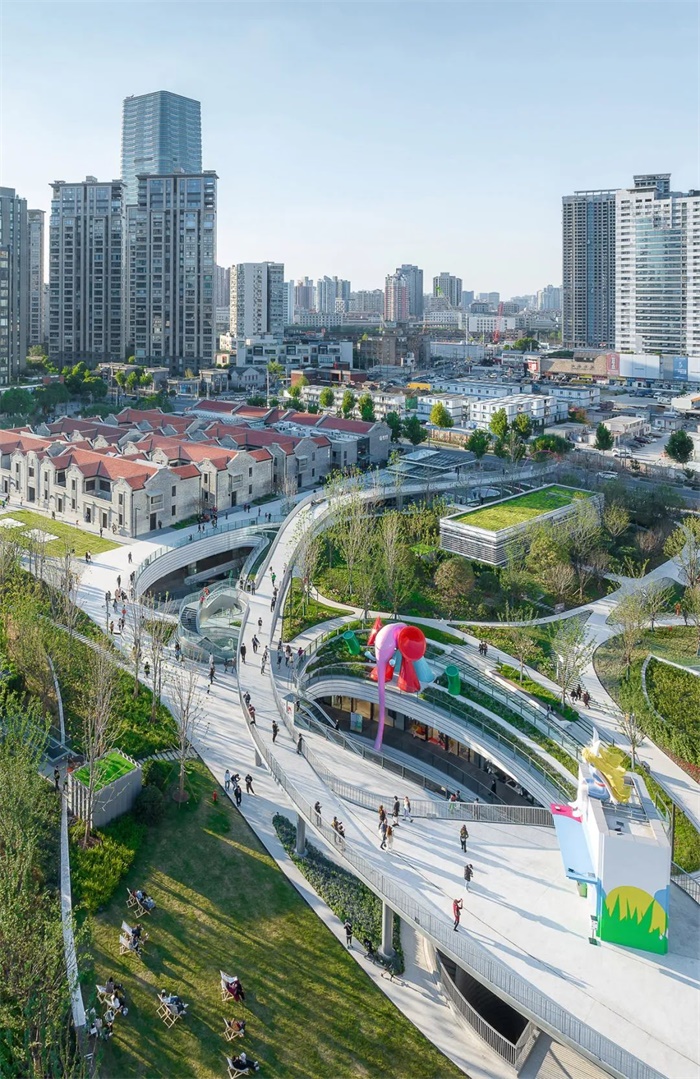基于项目整体设计的思考,Kokaistudios打造了一座“城市峡谷”。两层地下商业空间嵌入“峡谷”之中,“峡谷洞口”的边缘通过层层退台的地景设计与地面绿地相连。除了一座四层新建的入口建筑以外,该项目最重要、最整合性的要素是地面绿地本身。作为令当地居民和来访游客向往的公共空间,绿地的植入为城市中这个曾经被忽视的角落注入了盎然绿意和鲜明的色彩。