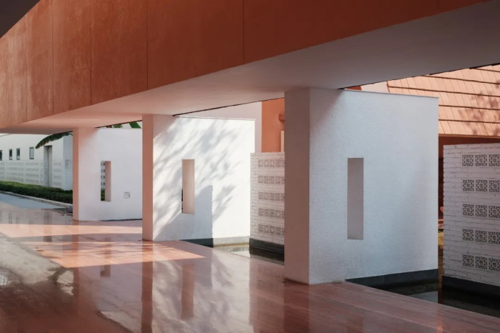 两侧以空心砖砌筑出的墙垣,犹如一道道屏风,似隔非隔,将两侧的建筑和水面景观暂时屏蔽在视线之外。水平高窗射入的阳光,把橙金色的高耸空间打亮,宾客的视线暂时已经专注在这座廊道中,直到在廊道尽头看到内部水景庭院,空间才豁然开朗起来。