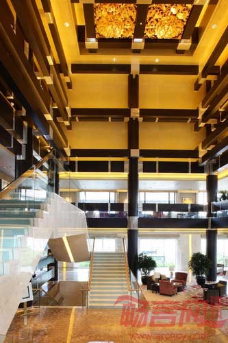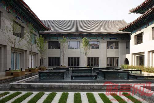 在总平面的布置中,建筑沿南北向设置主轴,该轴成为客人行为的主要流动方向,建筑沿此轴东西展开。自然围合出的四个院落采用了与四合院的空间相一致的内向性庭院。主要出入口设在北面,面朝金宝街,大堂、酒吧、展厅等公共活动区布置在用地北部,客房区布置在南部,做到动静分开,分区明确。