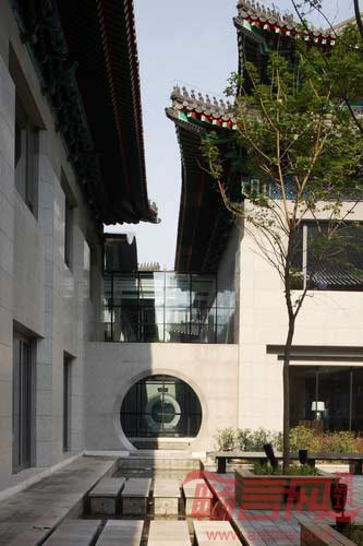 卷棚歇山的屋顶层层叠叠,错落有致。各个富有传统气质的单体通过6m×6m的玻璃通廊彼此联系起来,形成完整的院落,既保证各个区域通达的顺畅,又为建筑造型带来全新的感受,让客人透过现代的建筑材料欣赏到具有传统建筑美感的细部。鳞次栉比的屋顶与规整有序的庭院共同形成雍容典雅,气度非凡的建筑群落。