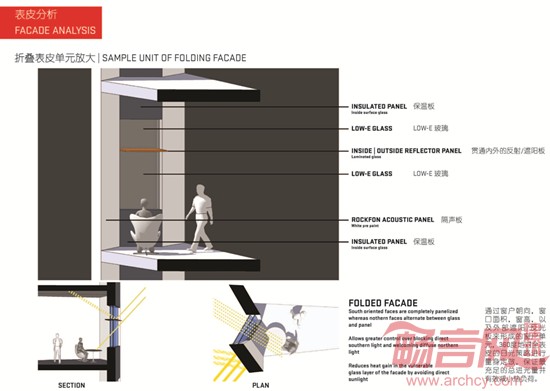 在多学科小组和3 D工具优化领域的辅助下,建筑从外立面、建筑表皮、内部中庭到天窗、就连一扇窗户的朝向、面积、高度,都经过了精确计算。使所有永久工作区域通过复杂的立面设计,达到了200勒克斯自然日光水平。主体上运用最先进的技术,通过顶部和四周全方位采光,实现了高效节能。能源消费低于25千瓦时/平方米/年,而且剩余的能量负荷能通过挡光板抵消殆尽。外表呈锯齿状分布的玻璃幕墙,可随光照角度调节强度,在采集太阳能即时数据变化的同时,也有效杜绝了玻璃幕墙导致的光污染。