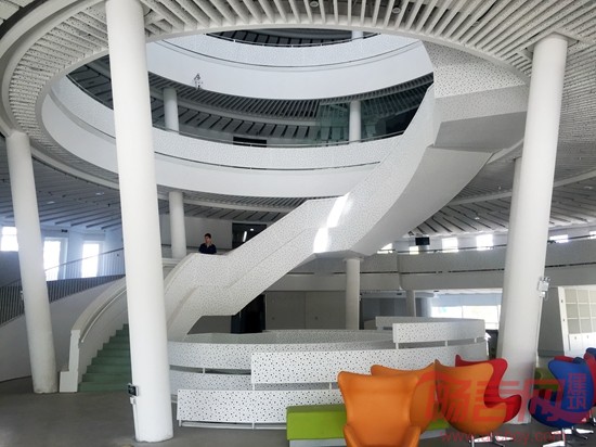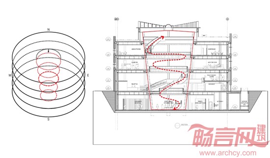 建筑内部没有传统空调,制冷供暖依靠的是全新的地源热泵技术。每层楼板厚度为30厘米,中间预埋了具有蓄冷蓄热功能的TABS(热辐射管道系统),分别与地下21口100米深井里的U形管相连。冬季,热泵机组从岩土体中吸收热量,向建筑物供暖;夏季,热泵机组从室内吸收热量并转移释放到地源中,实现建筑物空调制冷。