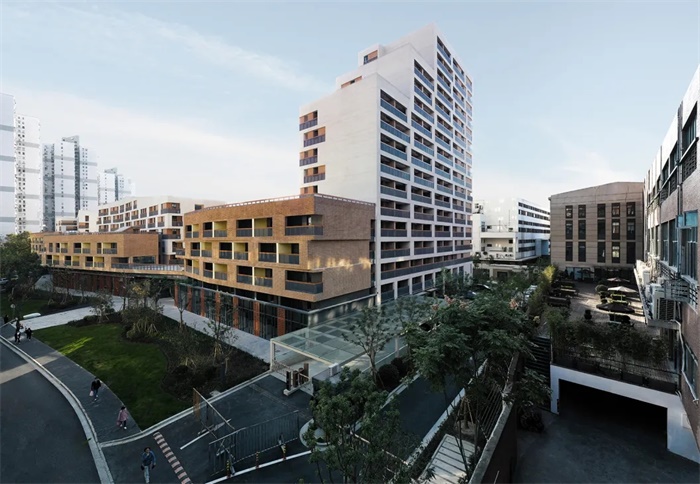由于用地非常紧张,又有大量公建,一层人流相对复杂,因此社区内部的公共活动交流空间被抬至三层。每幢建筑自身围合出邻里庭院。建筑间的两个公共平台与建筑内院共同组成公租房住户交流活动的主要公共空间,并通过大台阶向社区内一层开放。