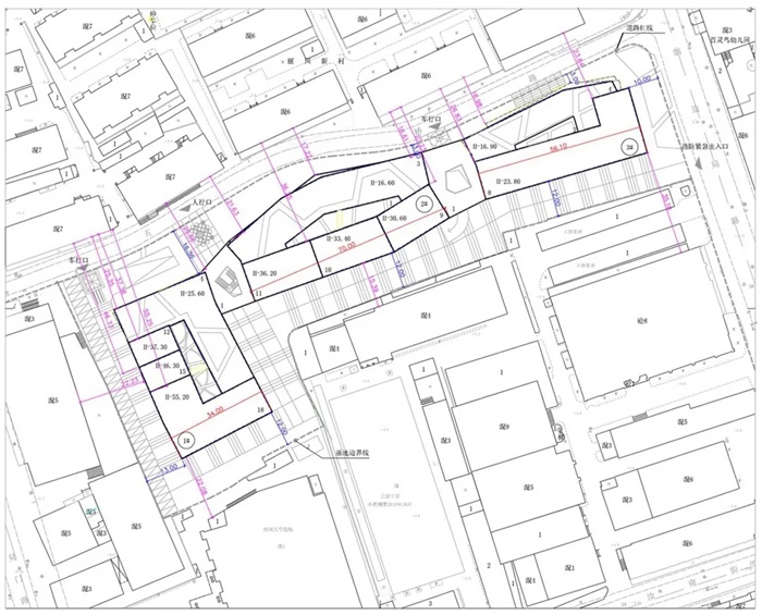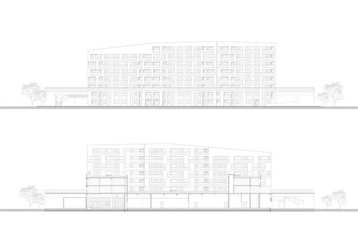 西端建筑底层临路及东北向无日照区布置经营型办公及公租房的物业居委等行政设施,其余为住宅。上部住宅均在各号房底层设有配置信报间的单元门厅,位于南侧不临路的区域,与公建区流线互不干扰。
