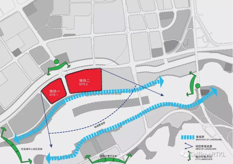项目基地位于梅溪湖北岸,从湖中及沿湖景观带上均有非常好的观赏角度,项目形象极为突出,在塑造滨水城市形象方面有重要的作用。从西边二环线上可俯瞰基地,南边的岳麓山和其支脉桃花岭也可以远眺基地。