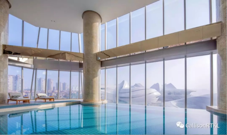 酒店大堂的设计,充分利用周边的景观优势,通过高透玻璃幕墙,向东可以尽享文化艺术中心建筑姿态,向南可以亲临梅溪湖的自然风光。双塔其他配套功能也尽量遵循这个空间设计的逻辑,尽可能围绕文化艺术中心和梅溪湖产生更积极的视觉互动。例如酒店泳池和健身中心,虽然设置在塔楼低区,但无边泳池的设计使漫到玻璃幕墙边的水流与对面流线型的文化艺术中心,呈现出和谐和统一的整体效果。