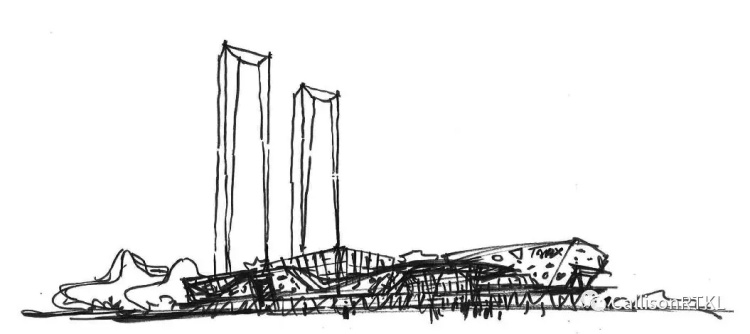 项目整体规划与文化艺术中心息息相关,两栋238米超高层塔楼矗立在艺术中心西侧,北塔为纯写字楼,南塔是上部为喜达屋豪华精选酒店的客房,下部为办公,底层是酒店大堂,成为裙房的一部分。双塔与文化艺术中心形成一个整体,西临城市高架路,文化加商务的功能共同形成符号化的城市形象界面。塔楼逻辑严谨的硬线条形象和强烈秩序感的室内空间,与灵动轻盈的白色文化艺术中心,形成了一个戏剧性的对话关系。通过地面人行流线融合,以及地下车流下穿隧道连接,两个地块产生集群效应,进一步形成和谐的城市关系和社区融合感。