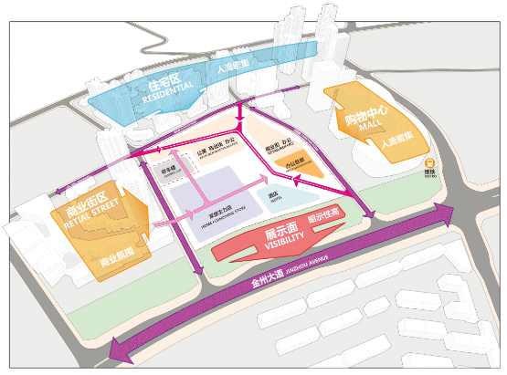 设计利用场地高差,以连廊将酒店、办公、商业三个功能区域有机穿插咬合。街区式商业贯穿地块南北,迎接各方而来的人流;五星级酒店前置,毗邻金洲大道形成良好的城市界面;公寓内置远离街道喧嚣;集团总部及办公楼沿干道而设,通过调整塔楼朝向,将建筑展示面最大化,顺势营造出东北角最佳的入口空间。