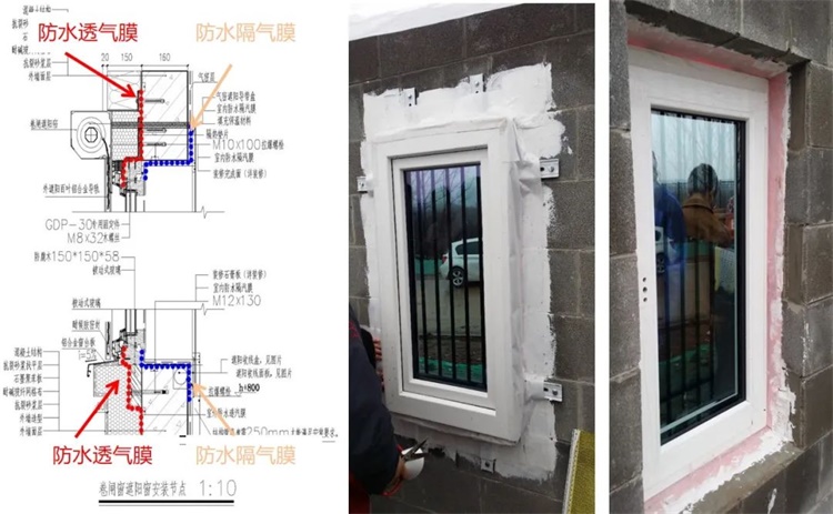 门窗洞口外侧需粘贴防水透气膜,内侧需粘贴防水隔气膜。