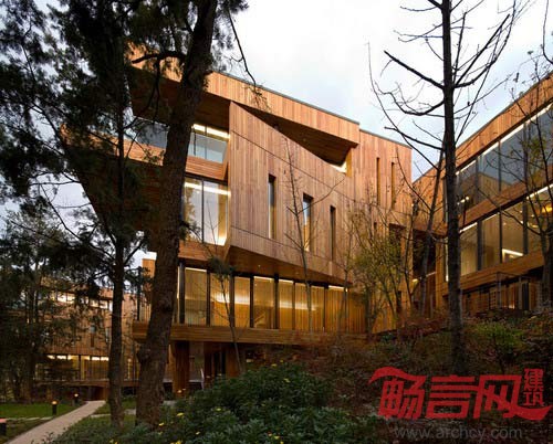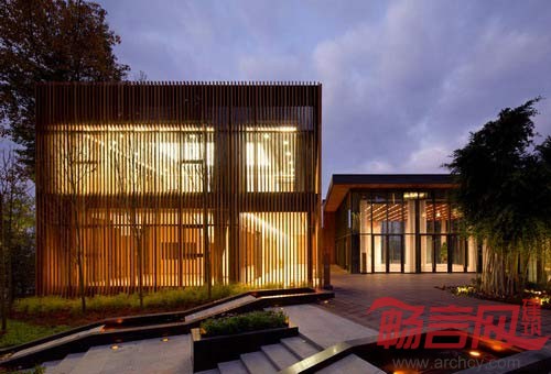 隐舍Innhouse坐落于云南昆明市郊覆盖着茂密树林的山地上,可以俯瞰山谷和整个城市景观。这处隐于林间的小型生态旅舍仅为旅者提供十七间体验式客房。依托起伏的山势并融合场地保留的树木,四座高低错落的L形建筑以村落的形式聚集,形成通过曲折步道联接并面向山谷的系列半开放庭院。每座单元建筑分为三个体量,即两个翼和半开放垂直上落空间,并通过景观廊桥连接。客房设计是林间风景的延续。起居和卧室的一侧面向山谷和庭院,设计开敞通透并结合深远出挑的景观露台。较为私密的卫浴一侧与起居空间通过木质的特征墙分隔,竖窗引入微妙的光线。旅舍大量采用竹木等自然环保素材表现朴实简约的形态。建筑落实低碳环保策略,协助拓展当地日益兴起的生态旅游的视野。建筑依照当地的气候特点,通过模拟和被动环境调节实现自然通风和采光。项目的可持续发展特点包括,分水岭策略、太阳能热水技术、高保温外墙体、双层low-e窗、屋顶种植、环保建材、透水性地面、LED灯、生态多样性和本地植被景观、新风热回收系统、高效能热泵、雨水回收用于景观、中水处理、绿色智能化管理。“隐舍”是建筑师在“创意绿色”概念下在中国完成的系列作品之一。