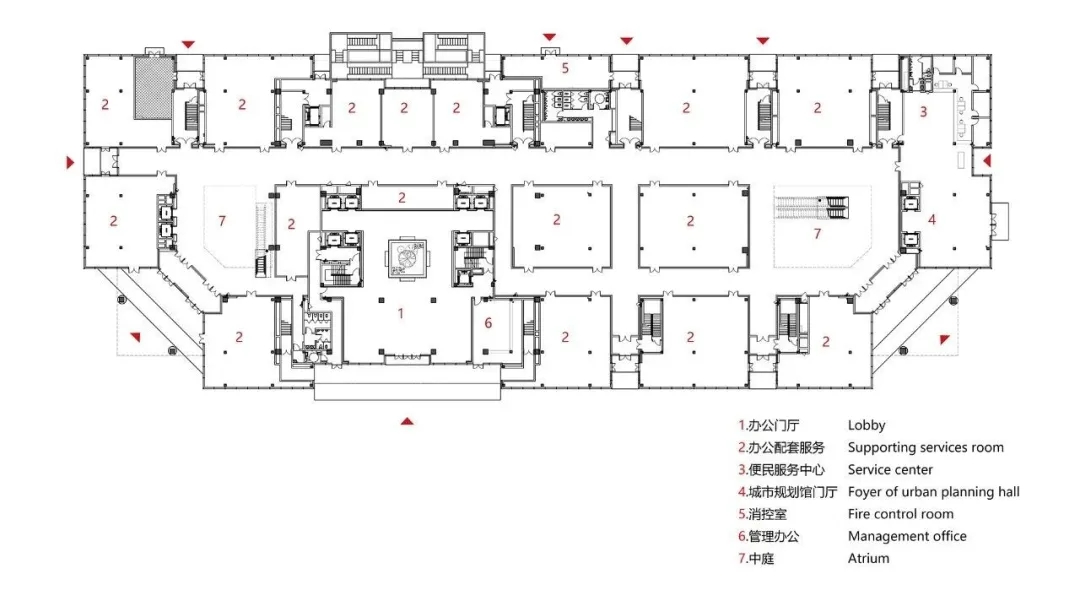 设计广泛运用节能技术塑造良好内环境。塔楼办公平面以传统“四水归堂”为空间意向,在建筑内部形成80米通高内庭空间;结合合理平面进深的设计控制,使得办公物业、核心筒配套均获得良好采光通风条件。当门厅顶部玻璃天窗开启时,形成拔风效应,极大改善内部小环境。