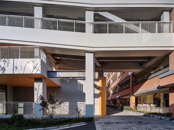 “悬空”的建筑以一种相对谦逊的姿态介入场地,通过挑空的处理方式减少其对场地压迫感,营造出对小孩子们足够友好的校园外部环境。建筑悬挑下方的室外空间足够高大,孩子们不仅可在下方举办各类活动,也成为他们一方遮阳避雨的室外乐园。
