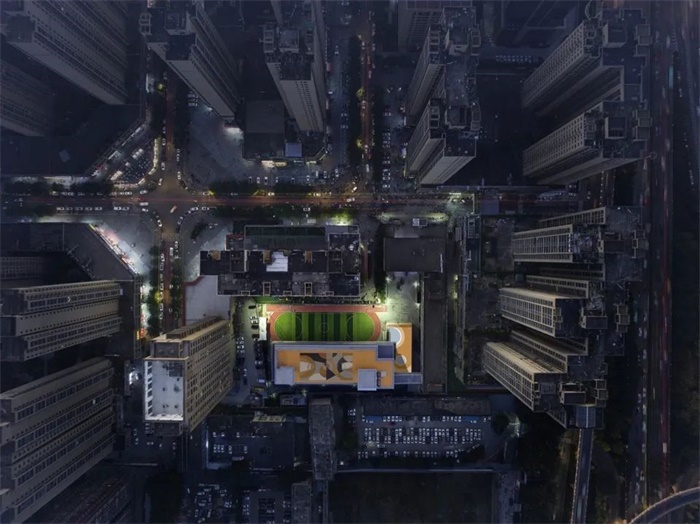 在如此紧张的场地中,置入任何建筑物都会显得十分强势,同样也会挤压有限的地面空间。出于对教学功能需求和室外空间感受的平衡,设计团队决定将建筑的半边悬浮起来,把更多的场地还给孩子们。经过日照计算,新建教学楼的位置选定于校园东侧,以保障教室获得充足的日照采光。我们将新建教学楼的西侧部分出挑约8m,挑空两层(高度约9m),上方3-5层承载普通教室和社团活动室等功能,满足了学校的使用需求。建筑挑空下方则是穿越而过的操场跑道。建筑的“悬空”使完整的操场得以保留,让每一个孩子享有“运动权”。