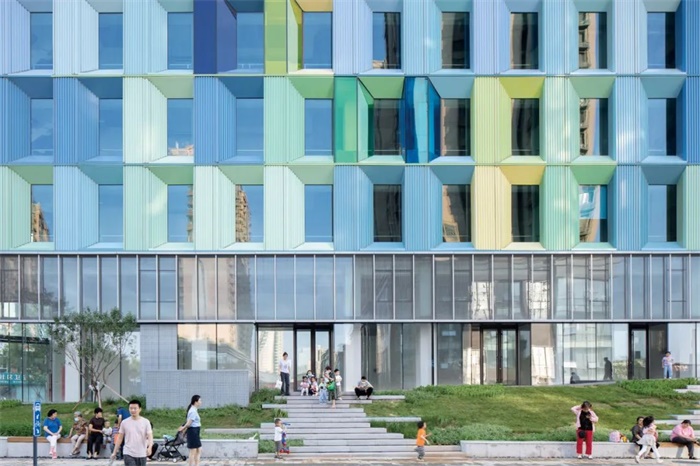 建筑立面的设计,在研究了各种立面设计相应的建构方式和整体效果后,最终于2017年底确定了单元化、简洁统一的立面形态,结合色彩的整体设计。
