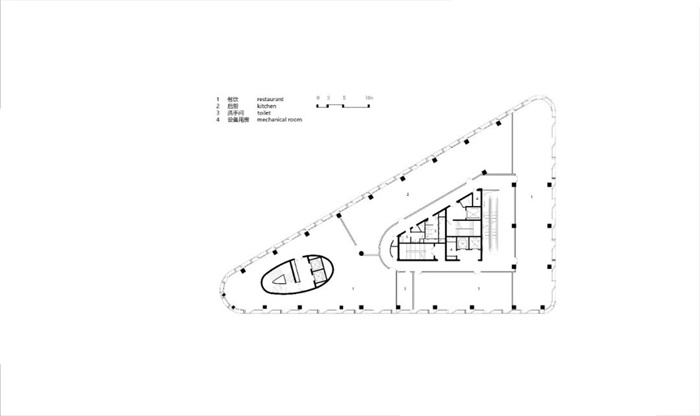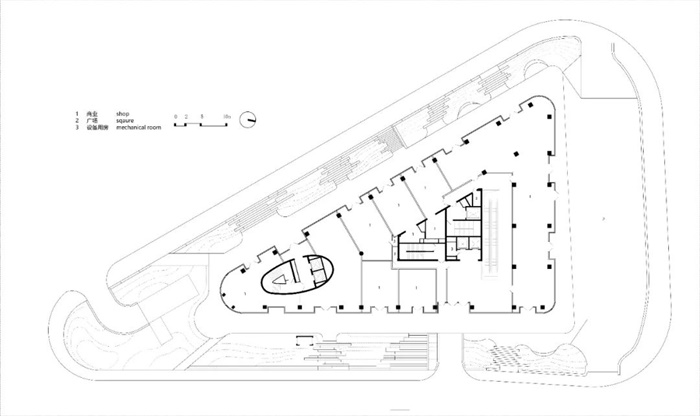 场地容积率、建筑密度指标和退线要求限制严格,建筑按照退线留出相应空间后,单层建筑面积仅不到1600平米,且呈三角形。而建筑功能复合,底层商铺,下部餐饮业,中上部为商务酒店,顶层为自持办公。多种功能的复合带来流线组织、消防疏散等问题,经反复讨论,形成双核心筒的平面布局:酒店及办公的相对私密的客流和商业的公共人流有各自独立的出入口及交通核,流线互不交叉,并很好的满足了狭长空间的安全疏散,同时结构上也形成了相对经济合理的模式。并且通过核心筒优化压缩设计,把周边的空间尽量留给商业使用功能,获得更大的使用面积。