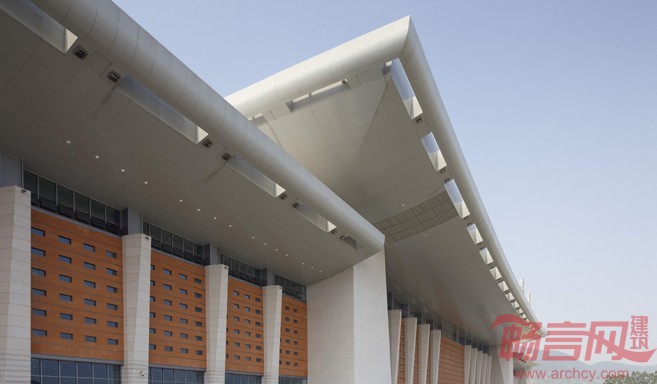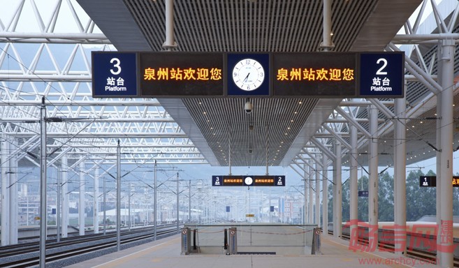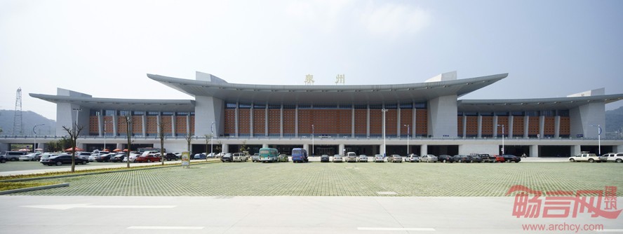 泉州站站房空间形态和立面设计新颖别致,建筑语言婉约明快。设计采用“极减”的现代设计理念,使建筑造型具有明快的时代气质,既照顾到历史与地方特色,又避免套用传统手工业时代的形式语汇;选用少量高新材料:屋顶檐口采用钛锌板,使处于高空的檐口成为带有金属光泽、非常精美的曲线。清新流畅的曲线划过天空,配合水平的条带玻璃,象征高速度的水平动态,加上富有闽南地方特色的红墙、白柱,尽显整体和谐以及现代化的建筑风采。