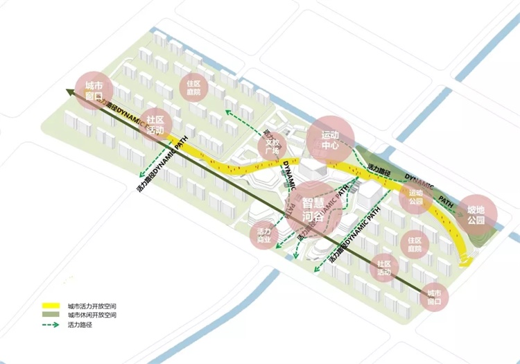 “三轴”:由盖上运动公园、小学、幼儿园、盖体边缘社区服务系统构建的未来生活云轴;位于区域中心,由智慧河谷、众创空间、邻里中心、商业等构筑的未来公共文化轴;南部沿着盖体边缘和河流打造别具一格的未来滨水景观轴。