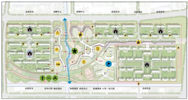 “一芯”:由商业、地铁办公、酒店、邻里中心、城市广场与河道景观等共同构筑城市活力核心区。