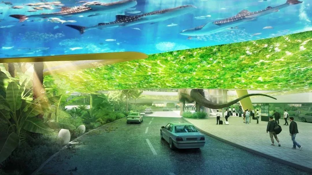 结合场地条件,设计团队提出了全新的布局模式。航站楼用地狭窄,场前设置高架桥非常困难。我们建议南侧用地不设高架桥,仅提供必要的大巴车和公交车落客,北侧为私家车、出租车、和网约车服务,同时为旅客提供便捷联系南北的摆渡车系统和步行通道条件。结合全岛免税政策,我们在北侧停车楼地面层设置主要值机区域,在空出的南侧场前用地植入商业和各种旅客服务功能,充分发挥场前用地的商业价值。