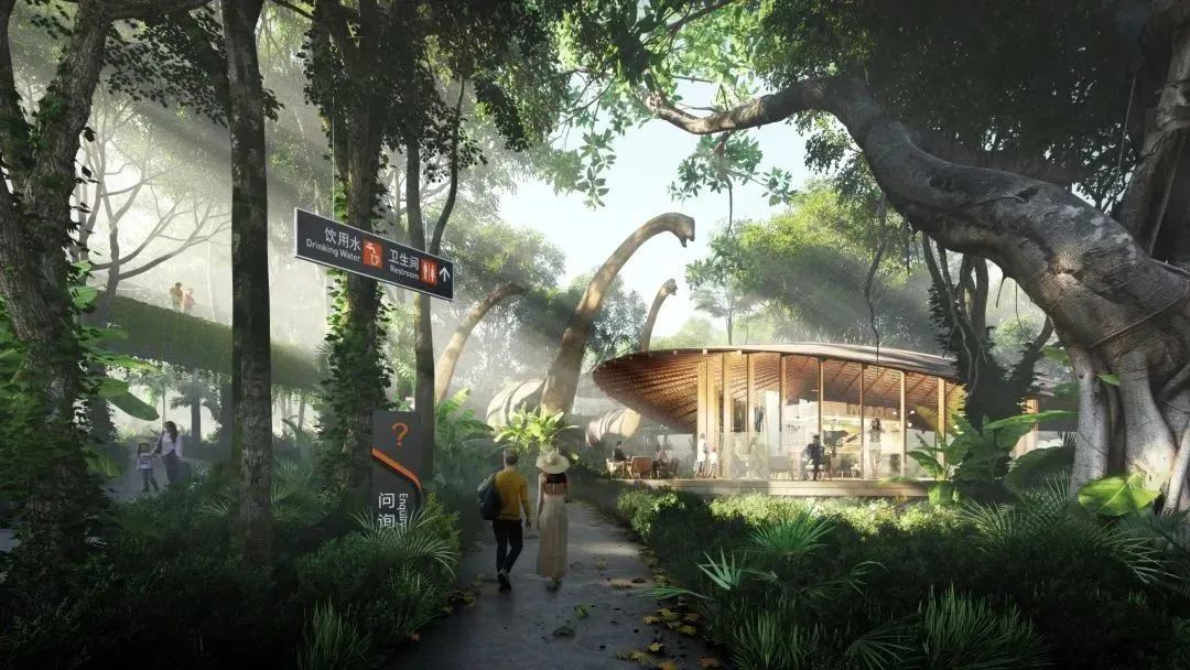 商业服务中心区域屋面以凤凰为主题,流动的造型宛如飞鸟的羽翼,象征凤凰还巢。观景台犹如宝石一般,悬空在凤凰羽翼之上,是凤凰森林的点睛之笔。羽翼如飘带般发散到场地,同时也是支撑结构。