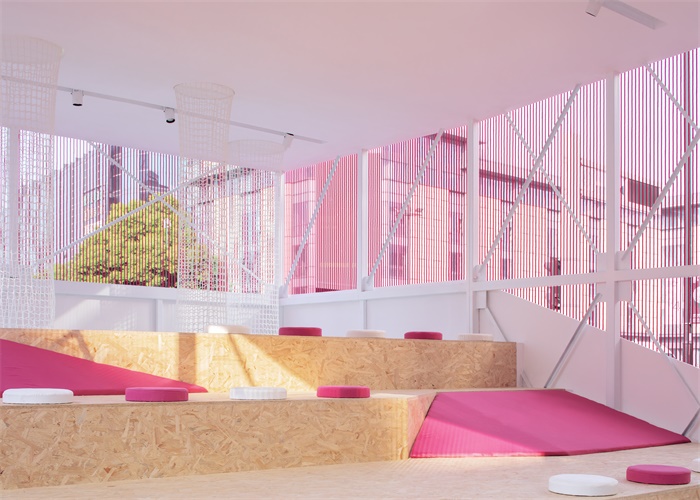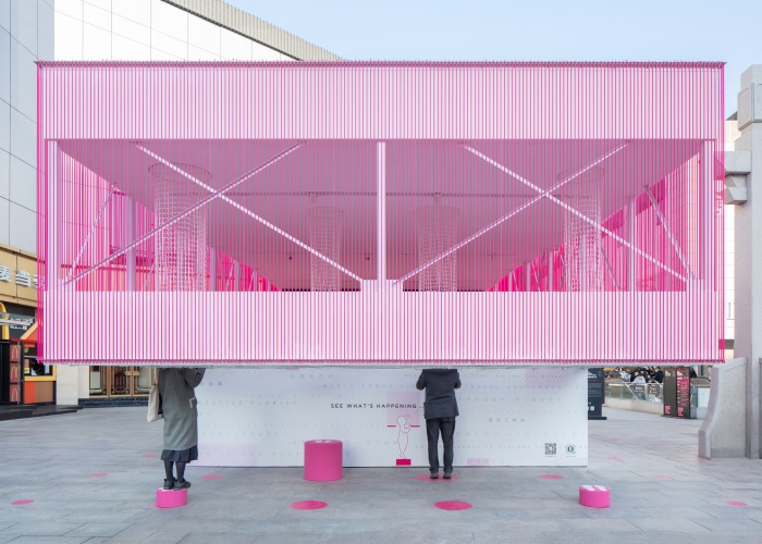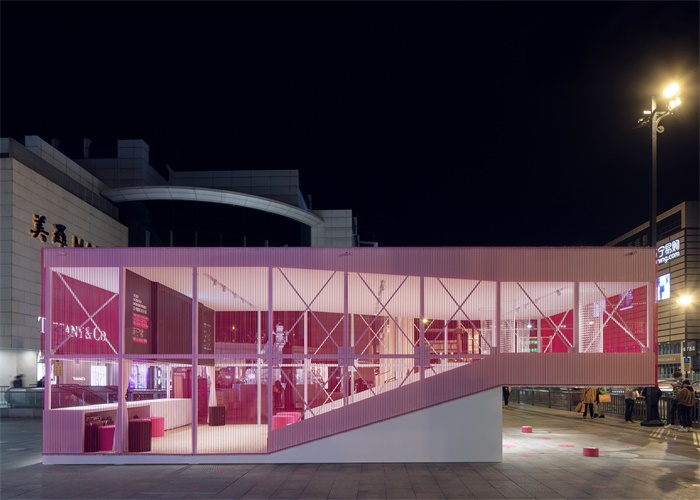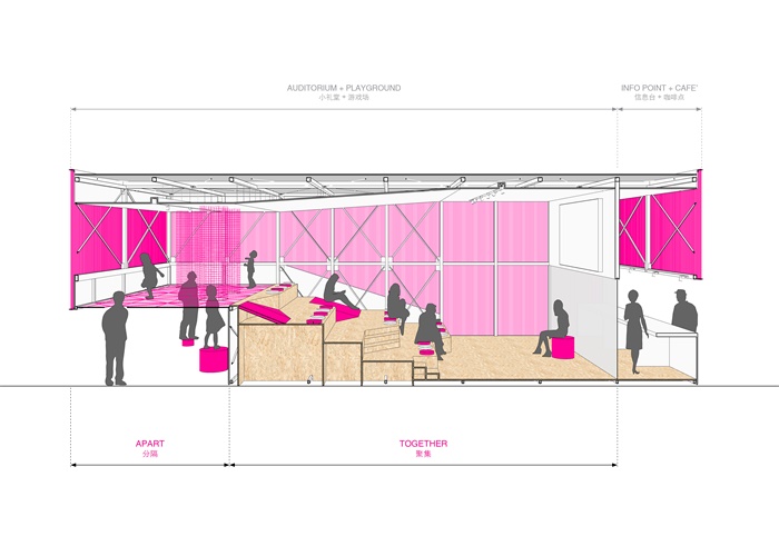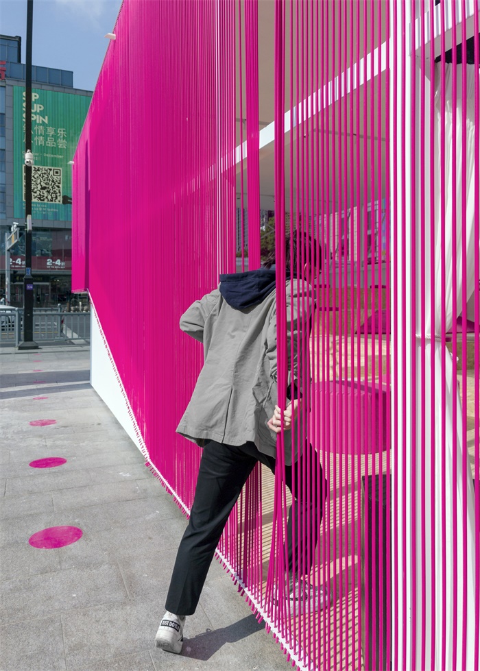 展亭外包裹着一层由硅胶管制成的彩色弹性表皮,这层表皮在保持展亭与广场的连接感的同时亦可适当过滤视线。苏州以其传统园林及建筑而闻名于世,而传统园林与建筑的过渡模糊了通常意义上“室内室外”的边界。我们的立面探索了同样的概念,即利用模糊的边界,既能引发路人的好奇心,又能为演讲者和内部的观众营造亲密的氛围。如果游客决定进入展亭,他们必须向两侧拉开弹性表皮让自己挤进去。这样的设计也是希望提醒人们当他们的个人空间受到周围人群的挤压时,努力保持社交距离仍然具有重要的意义。
