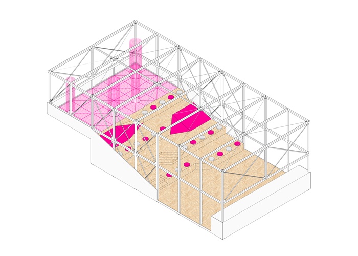 设计任务书要求设计师提供一处演讲厅/研讨会空间并附带问讯处/咖啡馆的功能。我们希望提供最多样化的使用场景,但同时又不强迫人们以某一种特定的方式去使用这个空间。当馆内没有特定活动安排的时候,这个展馆强化了周围广场本来的功能,并提供了一种人工地形,让人们可以坐下来喝杯咖啡看看书、躺在柔软的垫子上观看投影或在后面的悬挂网上玩耍。而在讲座等活动期间,游客可以自行决定是想进入馆内成为人群中的一分子,或是从后面的洞里从安全的距离以“偷看”的形式参与观展。