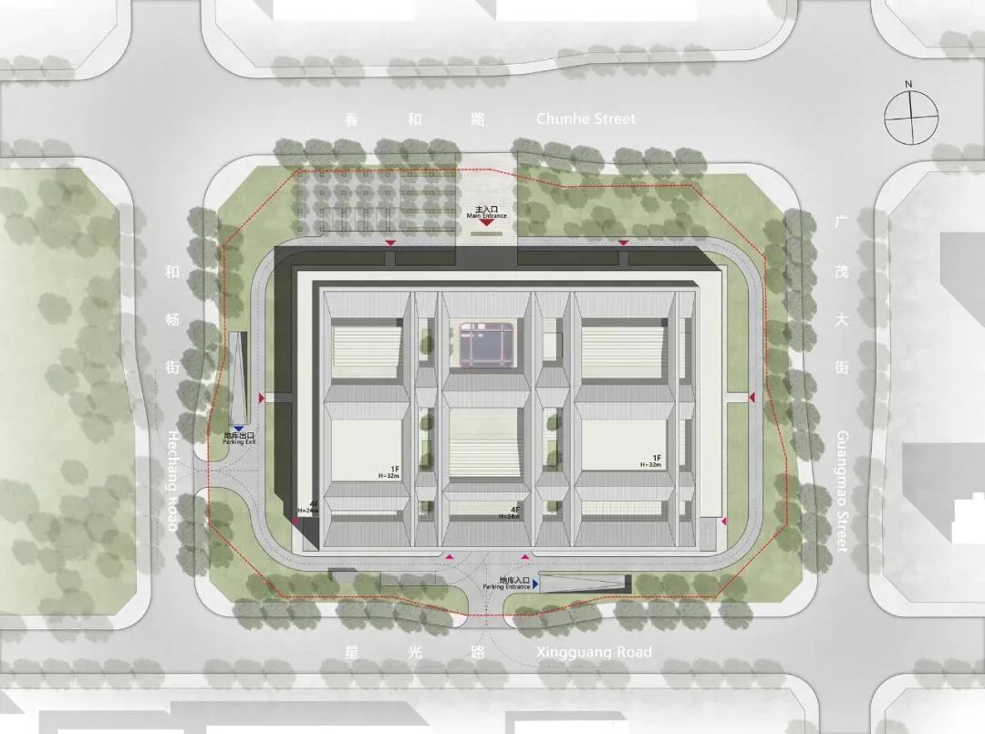 项目地上4层、地下1层,利用屋顶设置空中梨园,形成3个特色剧场与1个屋顶戏曲花园的“3+1”演出体系。剧场主门厅中央设置多媒体数字背景墙,兼顾非遗展示、艺术宣传等功能,营造浓郁的戏曲文化氛围。剧场顶部设空中梨园,以北京传统院落空间城市肌理为原型,形成融合戏迷交流、互动表演、休闲游憩、消夏晚会等功能的大众文化休闲空间,让艺术中心真正融入城市生活,与城市互动。