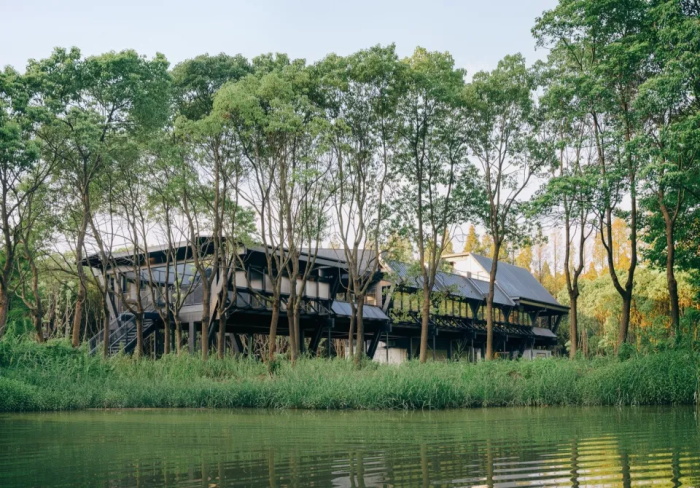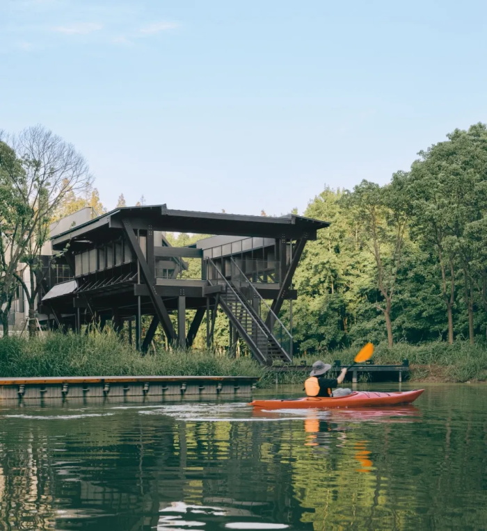 神奇建筑研究室选取了林地中的积水浅塘作为基地,这里既不挤占林地,也能利用浅池与主河道的天然联络,设置服务水上运动的码头和配套设施。对于建筑形式,干栏式长屋成为理想的模板。