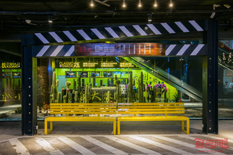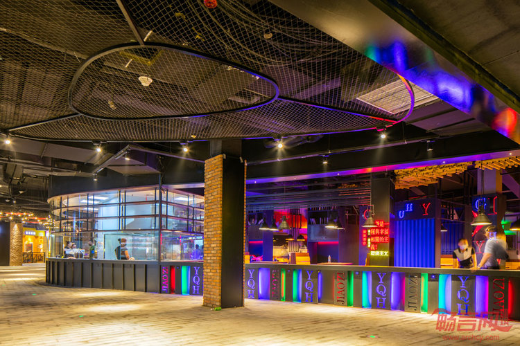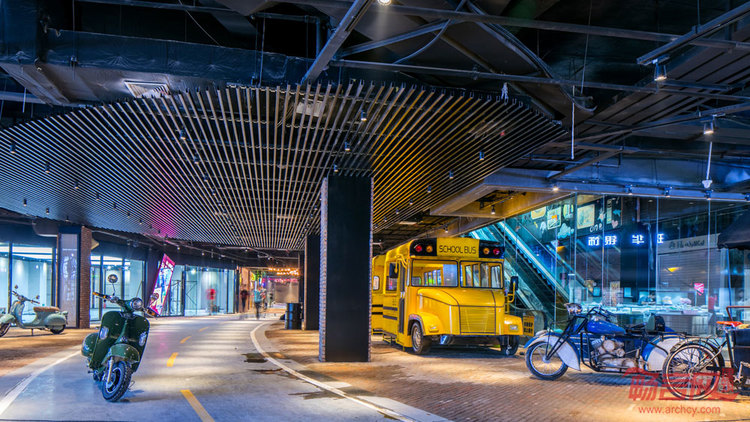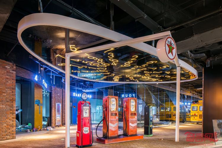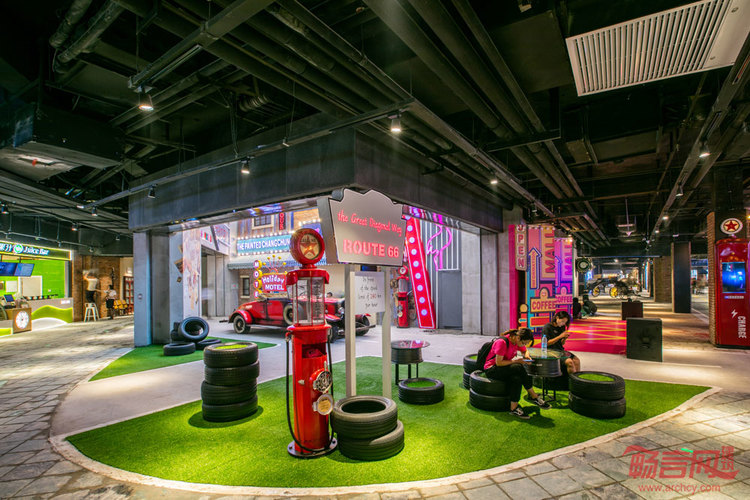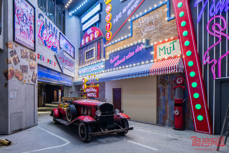 黄、蓝相间的灯泡矩阵下,是美国有名的“66号公路”。水泥自流平铺设的“66号公路”,中间的敞篷老爷车正迎面驶来。“公路”旁是不规则户外石材与方形混色砖块铺装的“人行道”,紧邻的商铺,散落在绿色草坪上的汽车旅馆、加油站,俨然一副美国西部作风,带你重回西部牛仔风行的时代。