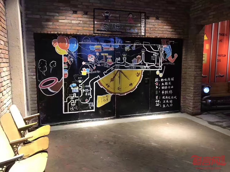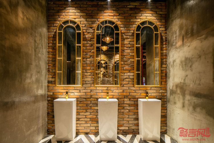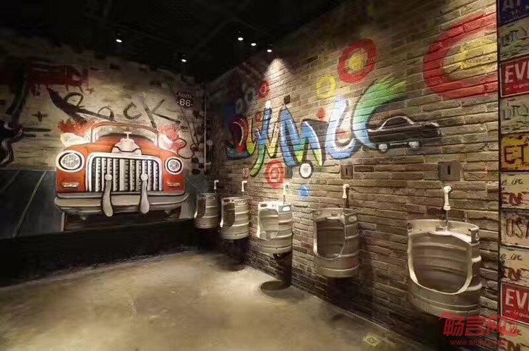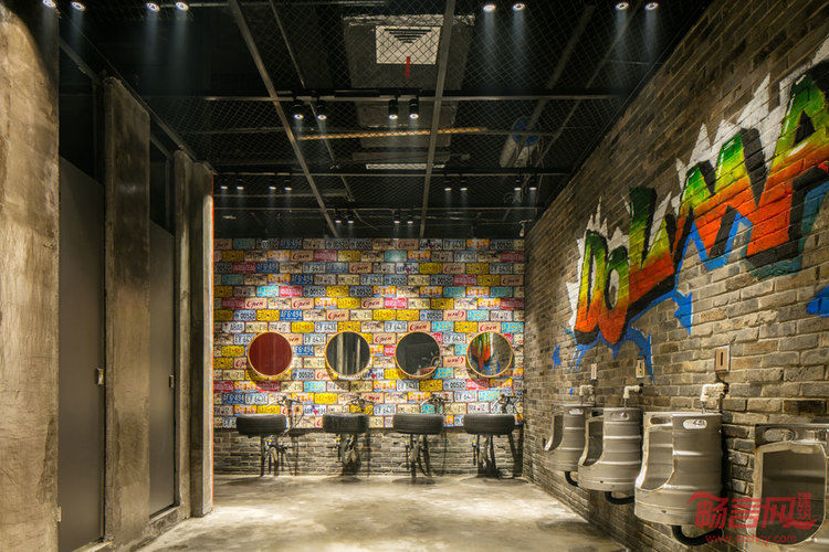 男卫生间以汽车主题为中心,装饰车行线的水泥自流平地面一直延伸到墙面,再辅以喷绘涂鸦,极富立体感。灰色砖墙上的多品类车牌,类道路反光镜的镜面,轮胎造型洗手台,黑色金属网格,一种放纵不羁的颓废感,尽显酷炫潮流。