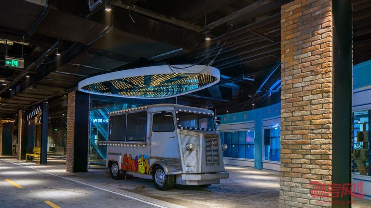 由废旧大卡车改装的冷饮吧,随处停放的复古车小品,为来往的人群提供最佳休憩场所。轮胎吧主题区少不了的是轮胎,天花处悬挂的大小各异的自行车轮,汽车轮胎组合而成的各种造型的餐桌与座椅,打破思维定势,化废为宝,物尽其用。