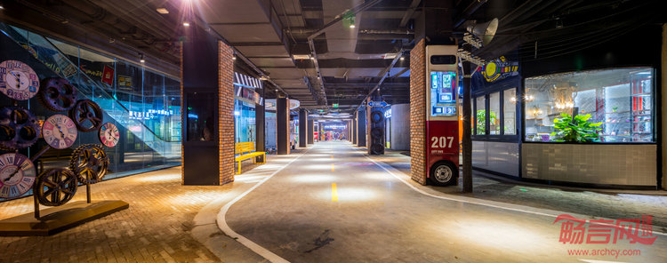 墙面上的立体F1赛道,流动的灯光,充满动感,一辆赛车宛若从天而降,驶入地下主题商街。F1赛车仪表盘主题墙,喷涂的标识与旗帜,拱桥上的Q版车模,方向盘造型阶梯扶手,方形混色铺砖与各色车牌的组合,渲染出可传递的赛场上的欢乐氛围。