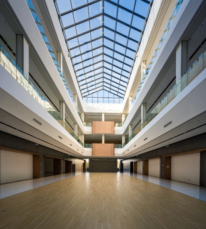 中央绿轴、下沉庭院、外置楼梯、空中花园等多层次交流空间鼓励跨领域碰撞。