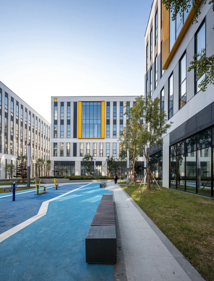 西南两侧的河道景观与下沉庭院共同构成“呼吸式”生态网络,园区绿地率达19%。