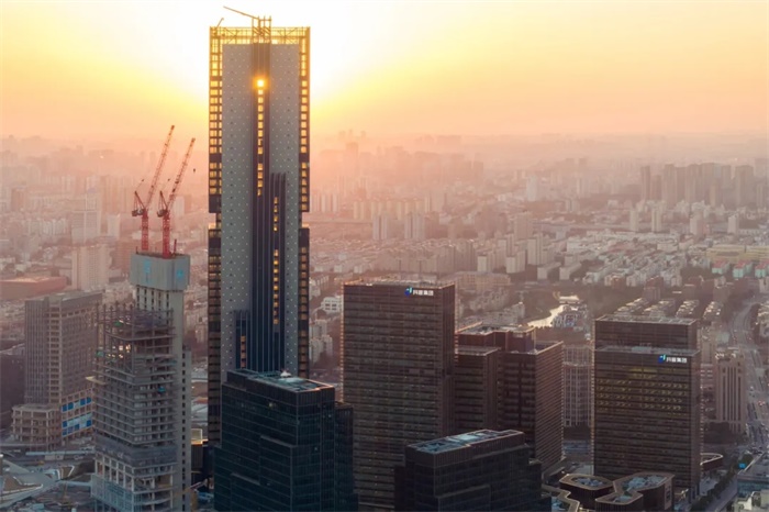设计点睛之笔是精雕细刻的体量开口,形成雕塑般的“空中露台”。这些塔楼中部的空间容纳了多个协作区,犹如尚浦领世开发项目的社交催化剂,并在视觉上串联起办公空间。“空中露台”与周围建筑的高度一致,使摩天大楼呈现和谐的比例和巧妙的韵律。竖向青铜色翼板进一步提升了塔楼的优雅感,并为室内空间提供了衔接完美的采光和通风。