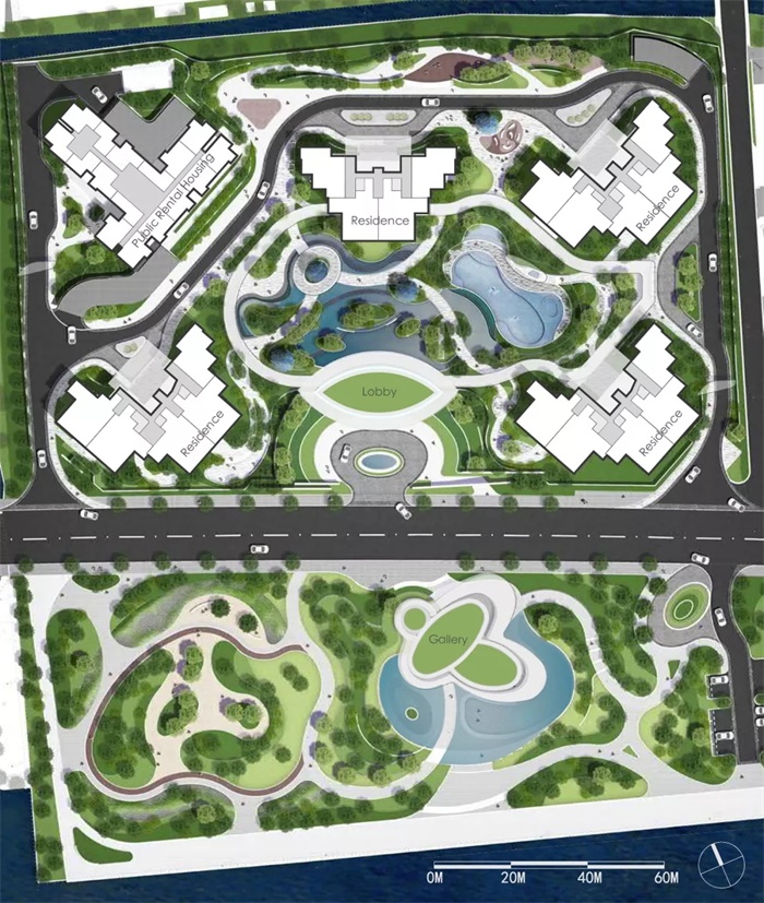 友好的天际线:沿江一线布置两栋60米的楼王,第二线布置三栋150米的高层住宅,高低错落的点式布局,形成丰富变化的天际线,既减少对江边的压迫感,又保证城市空间的通透感。