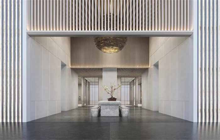 高层院落生态住宅的特点在平面设计中充分体现。以开放式核心筒改善住宅微气候,同时避免纯北向户型的出现;以空中花园和连廊作为共享交往空间。项目定位较高,基本达到一梯一户的梯户比,将电梯分散布置,让住户享有独立入户的私家体验。从电梯出来是私家入户花园,朝北望,中轴线壮丽景观尽收眼底。
