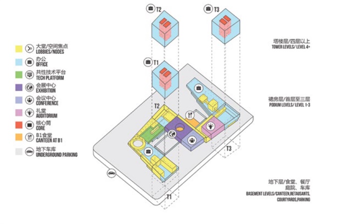 该项目主要用于小型SOHO办公室和孵化器等业务,并通过不同的楼板尺度来增强建筑空间的灵活性。面积达4000平方米的裙楼很适合大型企业办公,还为创造新兴的“生活式”办公环境提供了足够的空间。餐厅位于塔楼与裙楼的交界处,在此人们可以进入屋顶露台并尽情享受和俯瞰美景。塔楼和裙楼内部均设有大小中庭、互连楼梯和常规柱网,最大限度地提高空间自由度和灵活性,以促进人们的交流协作。