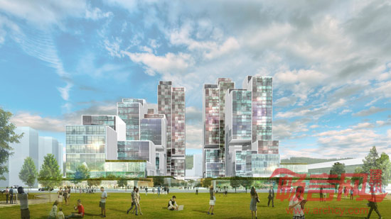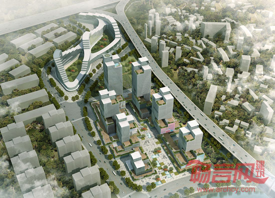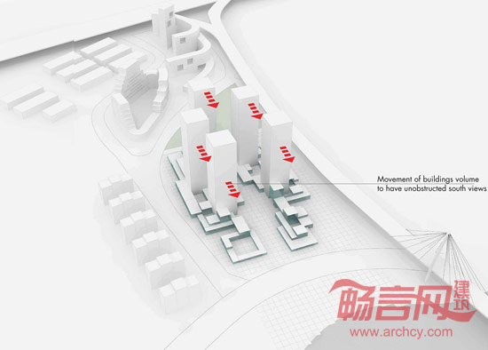 该方案设计整体外观为一组气势庞大、层叠分布的建筑群,高度逐渐朝河边递减,使阳光和风景均成为整个设计的组成要素。