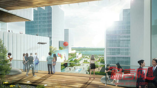 基于这一设计理念,地面层和建筑物屋顶均配置了绿化区,木饰及水池,透射出周围自然环境的舒适感受。建筑物外立面镶嵌LED显示屏,租户可以亲身体验科技魅力,使其电子设备与建筑物相连融为一体。