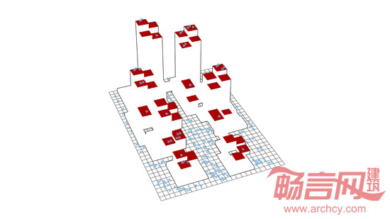 该地块被视作一个基本网格,主体单元为8.25×8.25m的方块体。网格功能恰如二进制电脑编程中的“1”和“0”。也就是说,视不同建筑设计和功能要求,方块体可以增大或减小。然后,这些方块体组合起来构成更大的方块体。按照所赋予的功能,方块体分为16.50×16.50m和33×33m两种尺寸。