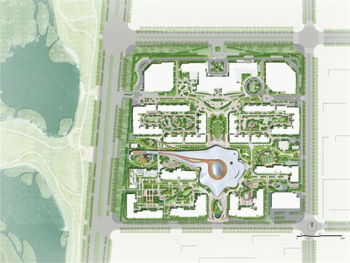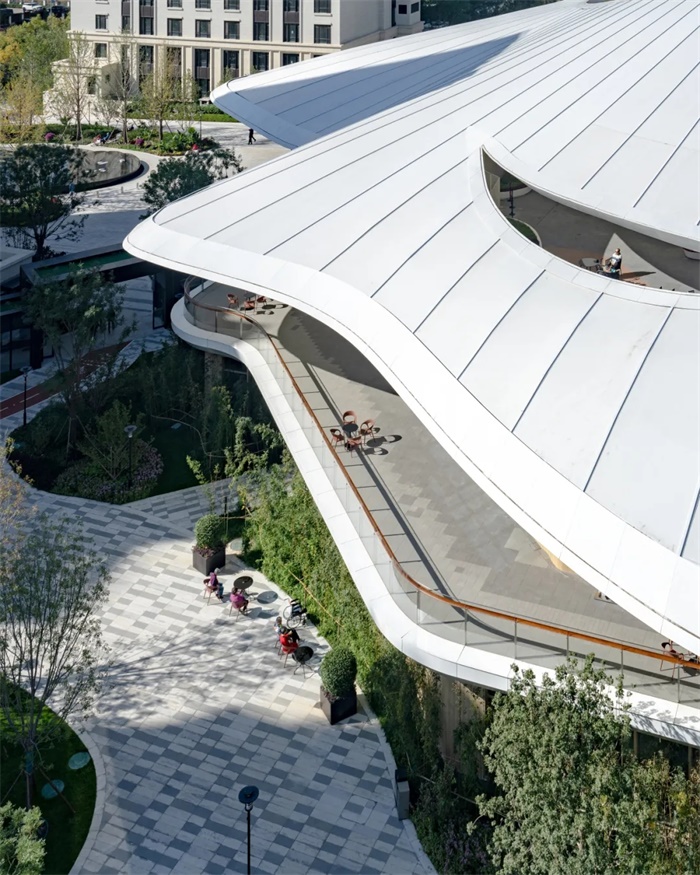 相对于四周规则的建筑形态,活力中心呈现更加自由和充满活力的有机形态。如一颗水珠滴落,在场地中激起涟漪,自中心散开、升腾,形成一片白色、柔软的云朵,最终转化为自由的大屋顶。